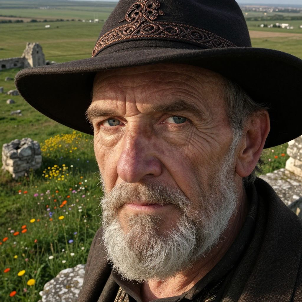 A breathtaking portrait of a distinguished gentleman with unfocused blue eyes and rugged features captures his enigmatic gaze. His thick silver beard and intricately embroidered wide-brimmed hat frame his face, revealing lines of wisdom and experience etched on his wrinkled skin. Soft golden light casts dramatic shadows across his angular features, exuding timeless strength and resilience. From a bird's-eye perspective, the background showcases a sprawling green landscape adorned with vibrant wildflowers and ancient stone ruins, symbolizing the passage of time and humanity's enduring spirit.