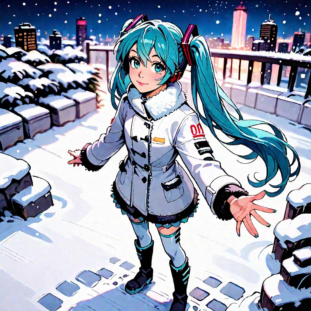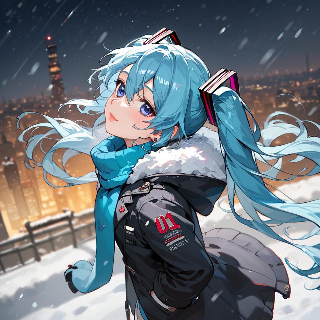 Score_9, score_8_up, score_7_up, score_6_up, score_5_up, score_4_up, rating_safe, source_anime, 1girl, hatsune miku, cyan hair, cyan eyes, twintails, long hair, jacket, coat, from side, looking at viewer, looking up, looking away, winter, outdoors, snow, night, starry sky, winter clothes, winter coat, scarf, light smile, white thighhighs, standing, reaching out, thigh boots, hand in pocket, snowing, cityscape, skyscraper, cowboy shot, depth of field, from above, foreshortening