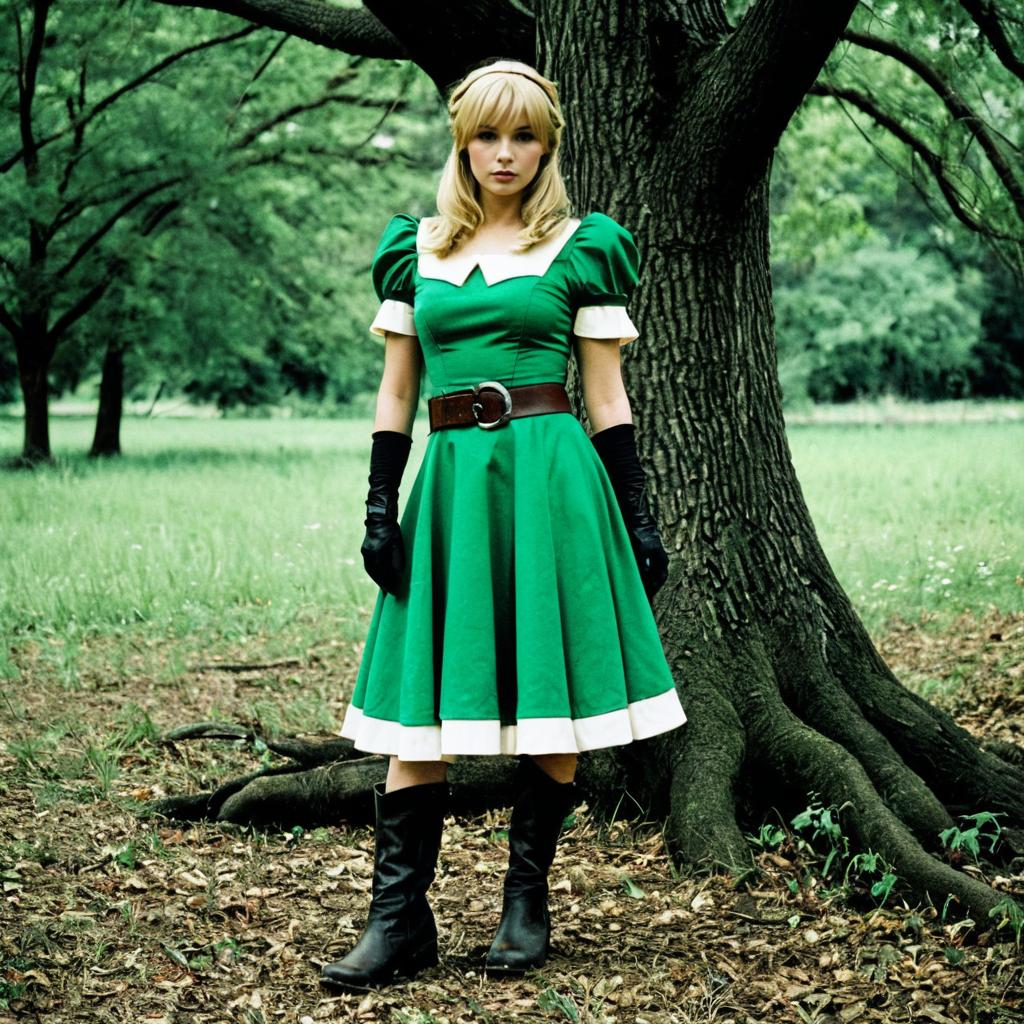 A young woman with blonde hair wearing a green dress with white accents, black gloves, black boots, and a brown belt. She is standing outdoors in a wooded area with large trees and green foliage. The setting appears natural, with leaves and grass on the ground, creating a realistic and immersive cosplay environment.