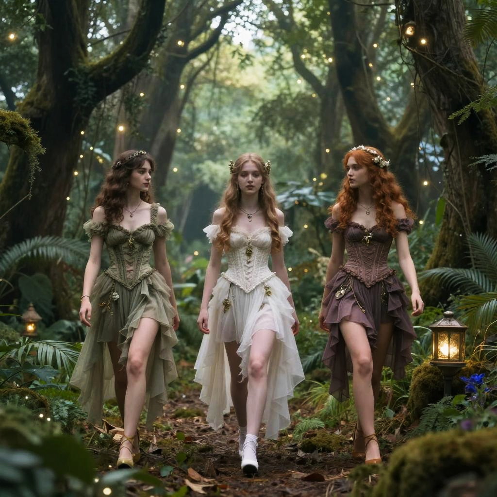 Photograph of three women walking through a lush, enchanted forest at night. The women, with wavy red and brown hair, wear fantasy-style dresses in green, white, and brown, adorned with floral crowns and intricate lace. The forest is dense with tall trees, glowing fairy lights, and lanterns on the ground. The path is covered in leaves and ferns. The women have fair skin and delicate features, and their dresses have flowing, ethereal qualities. The background is softly lit, creating a magical, whimsical atmosphere.
