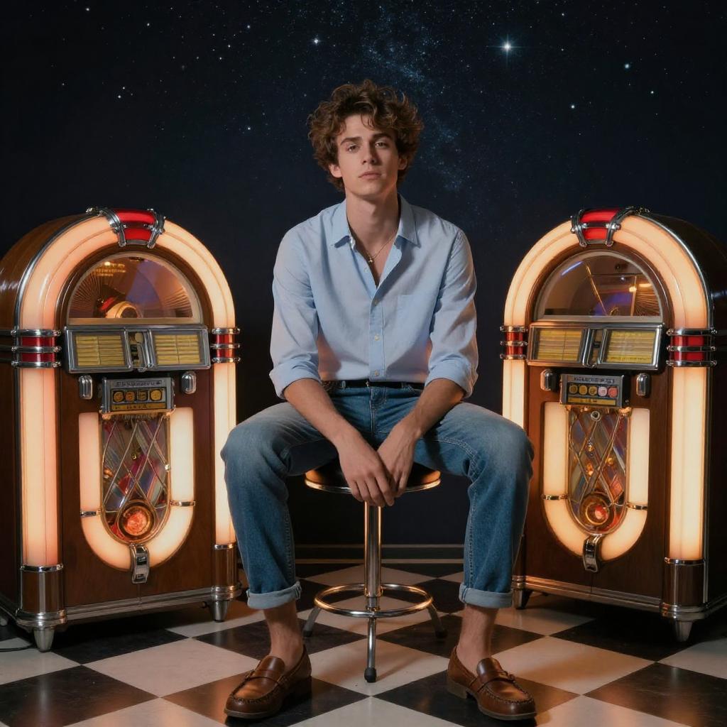 Photograph of a young man with light brown, styled hair sitting on a red stool in front of two vintage jukeboxes. He's wearing a light blue button-up shirt, rolled-up blue jeans, and brown loafers. The background has a starry night sky, and the floor is checkered black and white. He's smiling slightly, with a relaxed, confident posture.