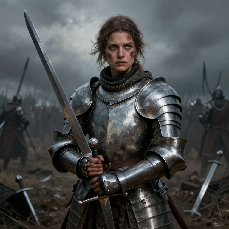 DGC style of A female warrior from the medieval era, inspired by Joan of Arc, standing amidst a grim battlefield, She wears traditional 15th-century plate armor, dented and scarred from battle, with a weathered tabard bearing a faded fleur-de-lis emblem, Her face is smeared with dirt and exhaustion, yet her eyes burn with determination, Her hands tightly grip a Gothic-style longsword, its blade reflecting the faint, cold light, The armor and the hands covered in mud and scratches, glistens faintly in the dim light of a cloudy, smoke-filled sky, The background reveals a dark, desolate battlefield, strewn with broken weapons and faint silhouettes of soldiers in the distance, Soft, diffused lighting adds a somber tone, emphasizing the harshness of the scene, Digital painting, cinematic lighting, medieval realism, sharp focus on the face, hands, sword, and gritty textures