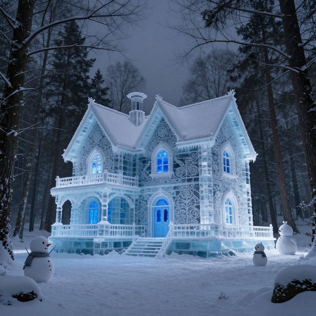 ((gloomy snowy forest)) exquisite house ((made entirely of ice)) etched in elaborate frost, dark blue lights in house, (snowmen on the lawn) photo realistic