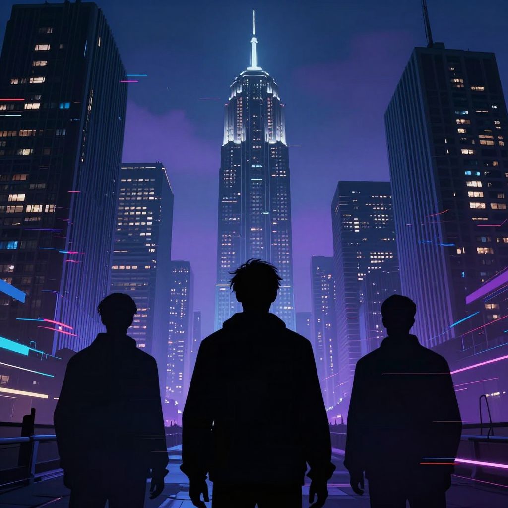 AI generated movie covers depicting dystopian futures, shadowy silhouettes against a backdrop of towering skyscrapers, moody color palettes with blues and purples, and glitch art effects to evoke a high-tech thriller atmosphere.