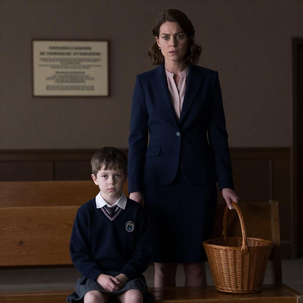 Photograph of a tense scene: a man with short black hair in a dark shirt grips the arm of a young boy in a plaid shirt, while a woman with brown hair in a navy dress stands between them, looking concerned. They are in a narrow, dimly lit hallway with glass walls.