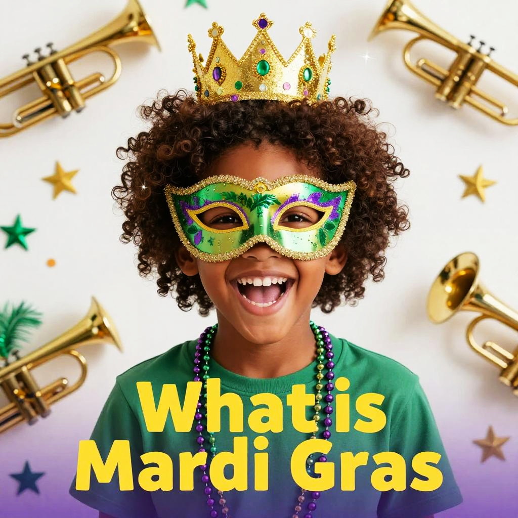 Vibrant digital illustration of "Mardi Gras" text in bold white letters, with a yellow crown, green leaves, and yellow flame accents
