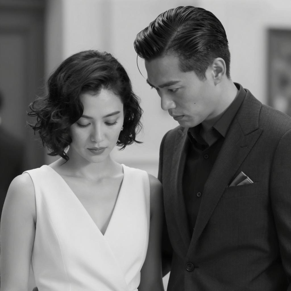 Black-and-white portrait of an Asian man and woman sitting closely together indoors. The man has short dark hair and wears a patterned long-sleeve shirt with rolled-up sleeves, looking contemplatively to the left. The woman has vintage styled dark hair, wears a sleeveless black top and dangling earrings, and is holding a cigarette near her mouth. They are seated in front of bamboo blinds.