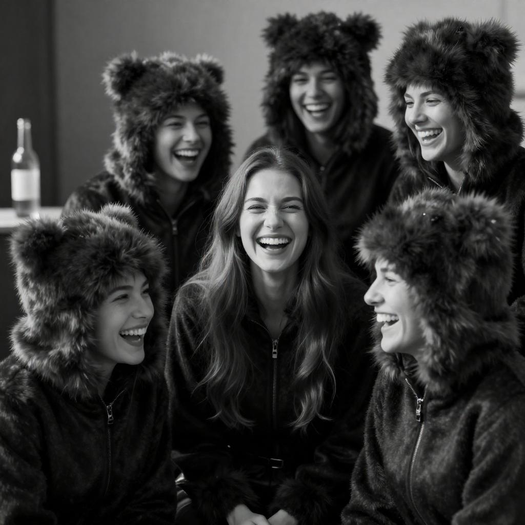 Black-and-white photograph of five people in dark, furry costumes laughing and huddled together. The central figure, a woman with long hair, smiles widely. The background is blurred, with a bottle on the left. The high-contrast image emphasizes their expressions and ures of the fur.