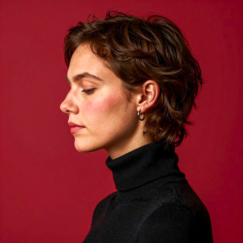 Black and white photograph of a woman with curly hair wearing a black long-sleeve top with belted waist, leaning against an abstract patterned wall. She has her eyes closed, appearing contemplative. In the background, two men are visible, one wearing a beanie and shirt, the other with dark hair and beard, both looking towards the woman. The setting is dimly lit with shadowy figures and a moody atmosphere.