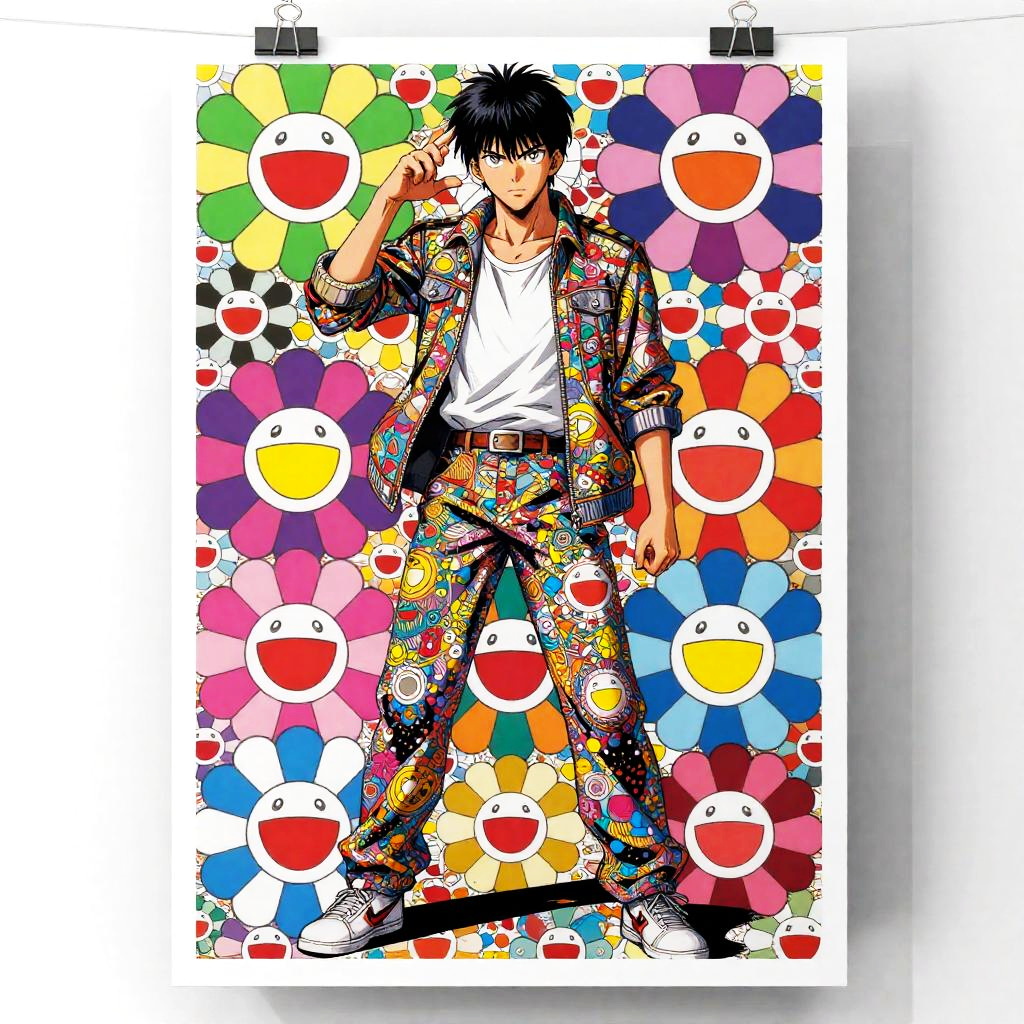By Phil Noto and Kentaro Miura, superflat motifs, glossy pop-surreal, bold color blocking:1.4, poster art, bold lines, hyper detailed, expressive, award winning, male, intricate details, masterpiece, best quality:1.4, looking at viewer, dynamic pose, wide angle view, in the style of Takashi Murakami