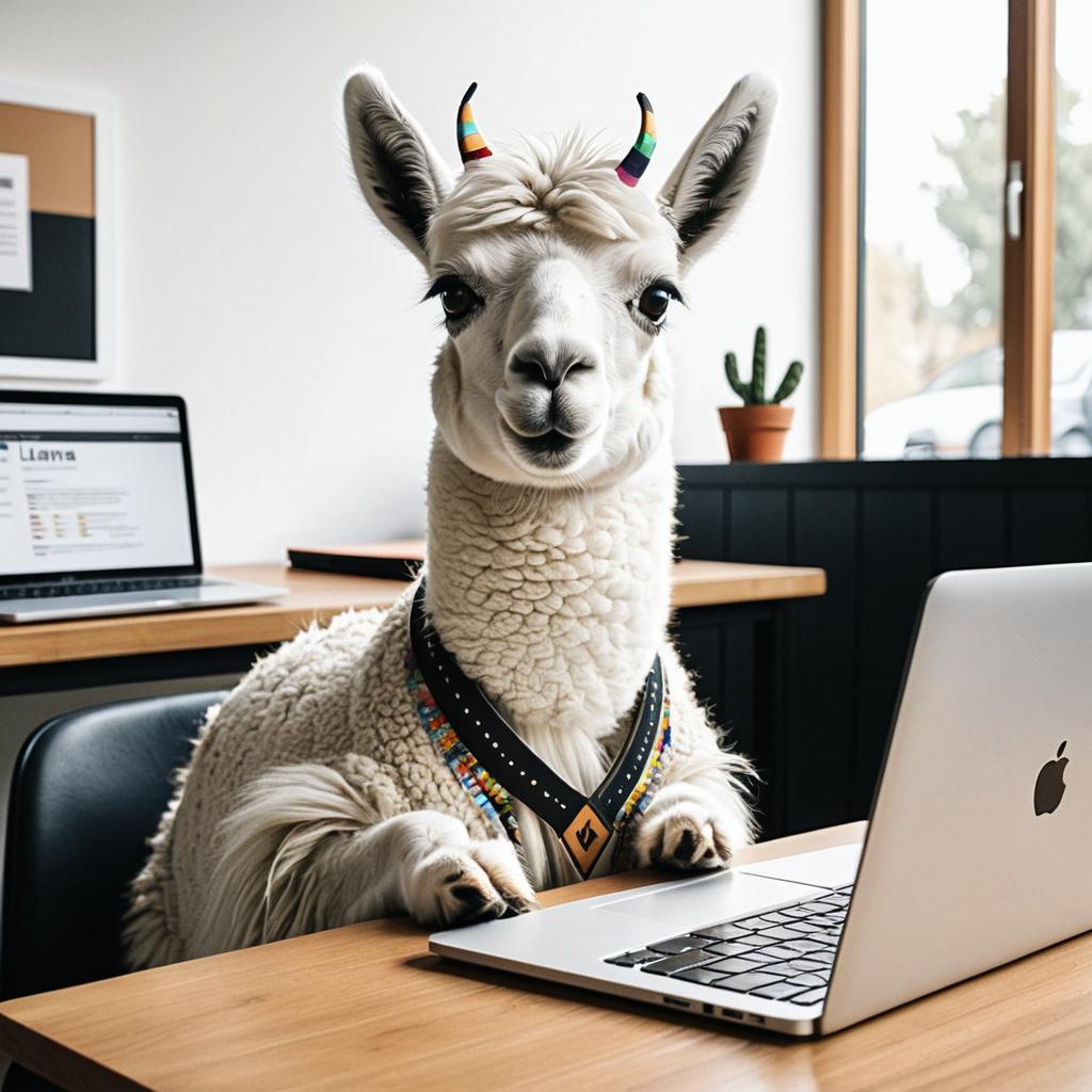 Create a cute and clever cartoon llama portrait, sitting at a desk with a laptop and resume. The llama should exude confidence and intelligence while maintaining a delicately androgynous look in a lighthearted atmosphere.