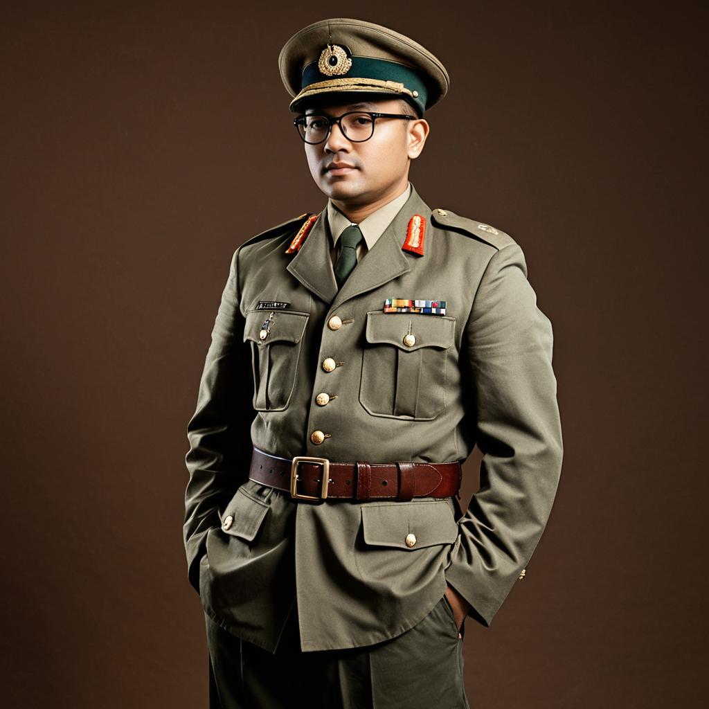 Subhas chandra bose costume,male focus, hat, 1boy, solo, belt, military hat, uniform, peaked cap, arms at sides, military uniform, pocket, realistic, long sleeves, military, belt buckle, looking at viewer, jacket, buttons, brown jacket, pants, glasses, closed mouth, brown belt, breast pocket, buckle, military jacket, standing, cowboy shot, shirt, brown background, hat ornament, grey headwear, simple background, brown pants