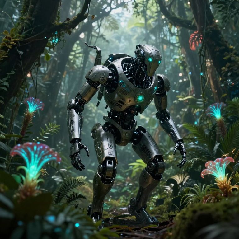 Photorealistic digital art of a glowing, metallic humanoid robot crouching in a dense, lush forest with bioluminescent flowers and dapp