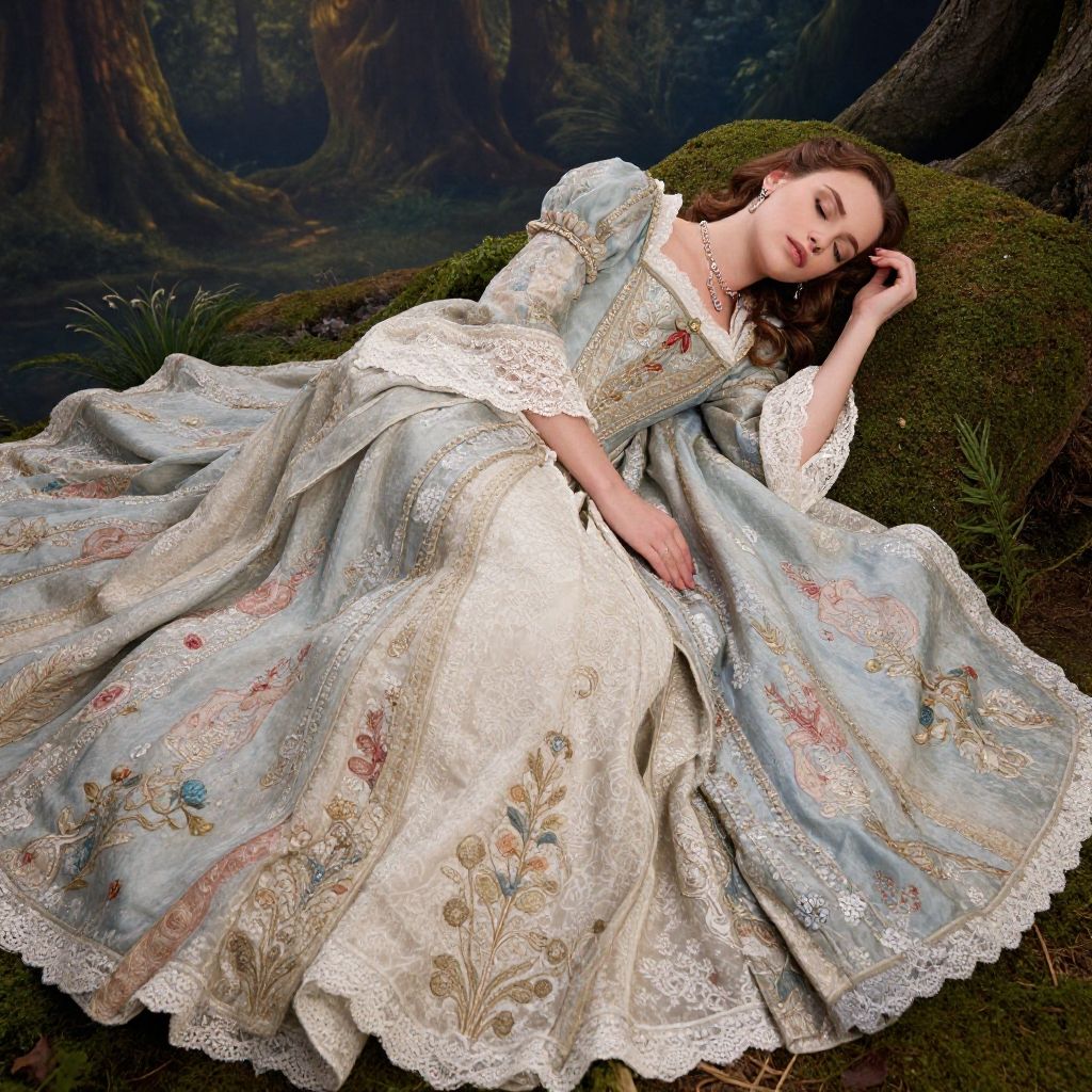 Photograph of a young woman with fair skin and brown hair, lying asleep on a moss-covered ground in a forest. She wears an elaborate, light blue, 18th-century-style dress adorned with white lace, floral embroidery, and gold thread. Her eyes are closed, and her right hand rests on her cheek. The background features dark, blurred tree trunks and foliage, creating a mystical, enchanted forest atmosphere. The dress's intricate patterns and textures contrast with the natural, textured moss and forest setting. The image exudes a sense of peaceful slumber and fairy-tale elegance.