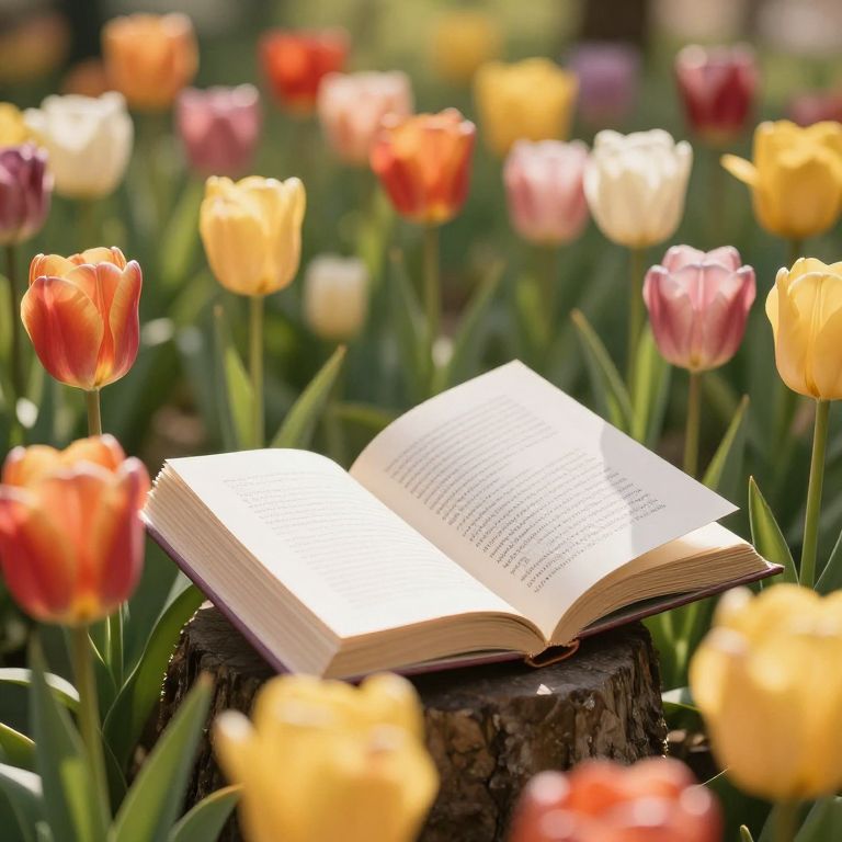 In a sun-drenched sanctuary where knowledge blooms, a reader finds solace amidst vibrant tulips, their petals whispering stories of growth and discovery, while the gentle rustle of pages and the warmth of sunlight weave a tapestry of serenity and intellectual freedom.