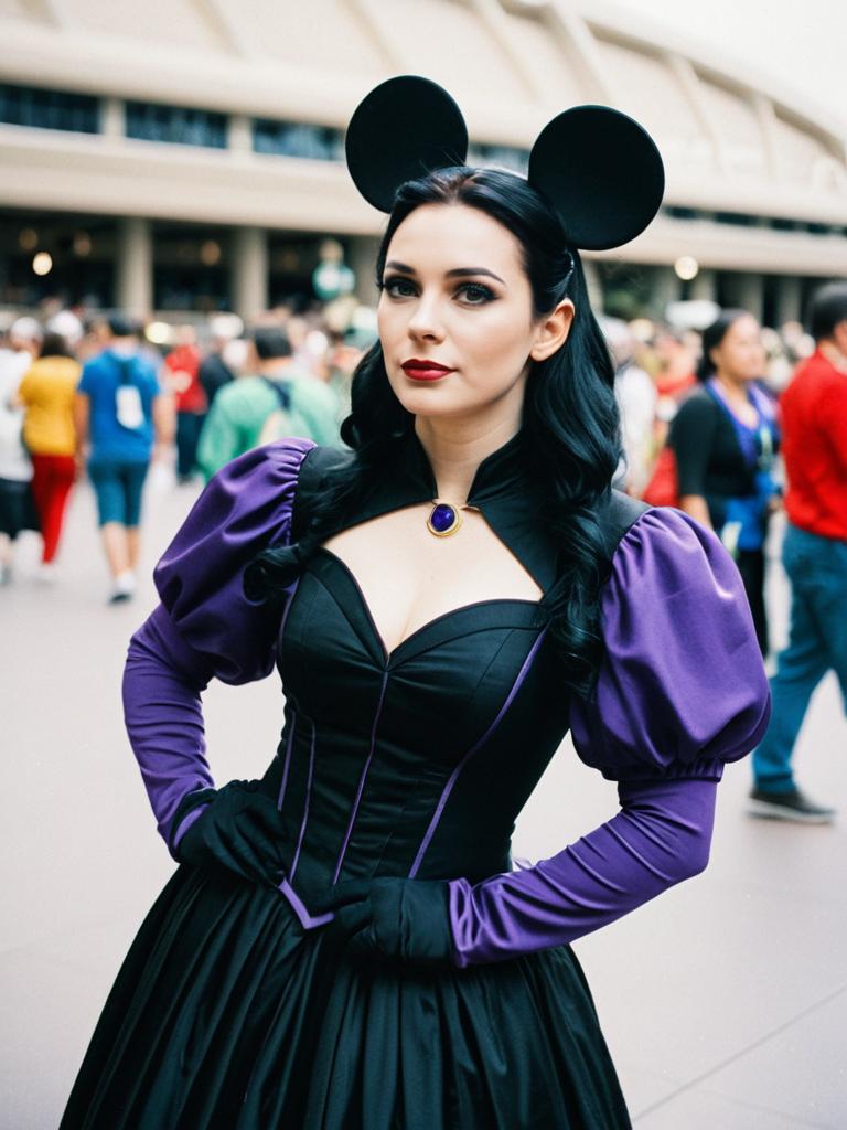Woman in Disney Villain costume, candid cosplay portrait at convention, natural light