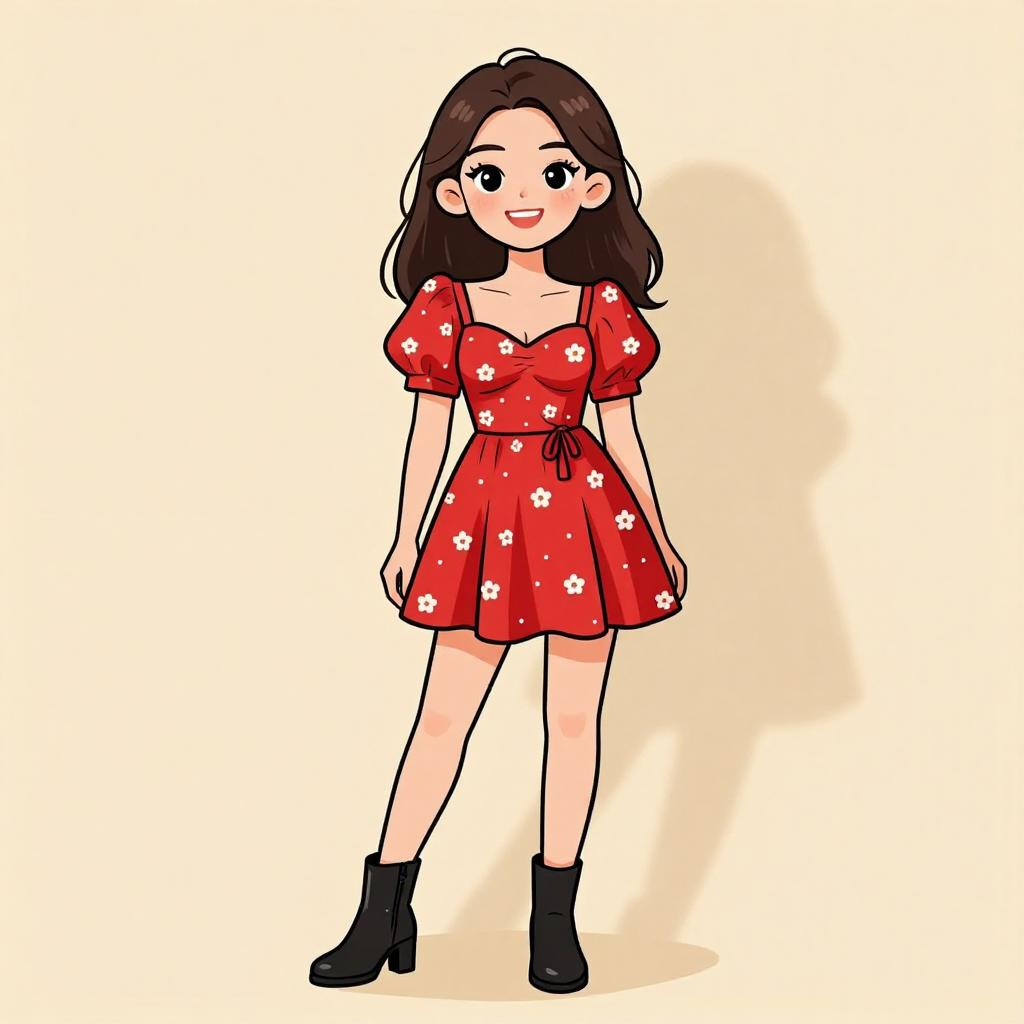 Woman with pretty face and pretty hair. smiling Woman, youthful and playful, red mini dress with small floral pattern, sweetheart neckline, short puff sleeves, fitted bodice, cinched waist, flared skirt, black ankle boots with a slight heel, studio background with shadow play and warm lighting. --sref 1467