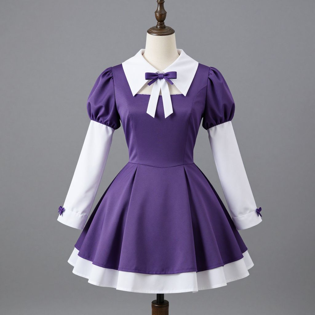 Photograph of a purple and white vintage-style dress on a mannequin, featuring puffed sleeves, white collar, cuffs, and bow, with
