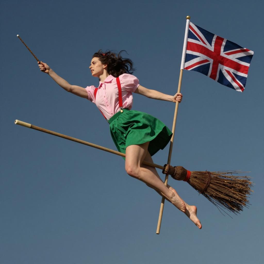 A woman with dark hair and fair skin flies on a broomstick against a dark blue sky. She wears a pink shirt, red suspenders, and green skirt. She holds a wand in her right hand and has a Union Jack flag attached to the broomstick's tail. She is in mid-flight with her body angled forward and legs stretched back.