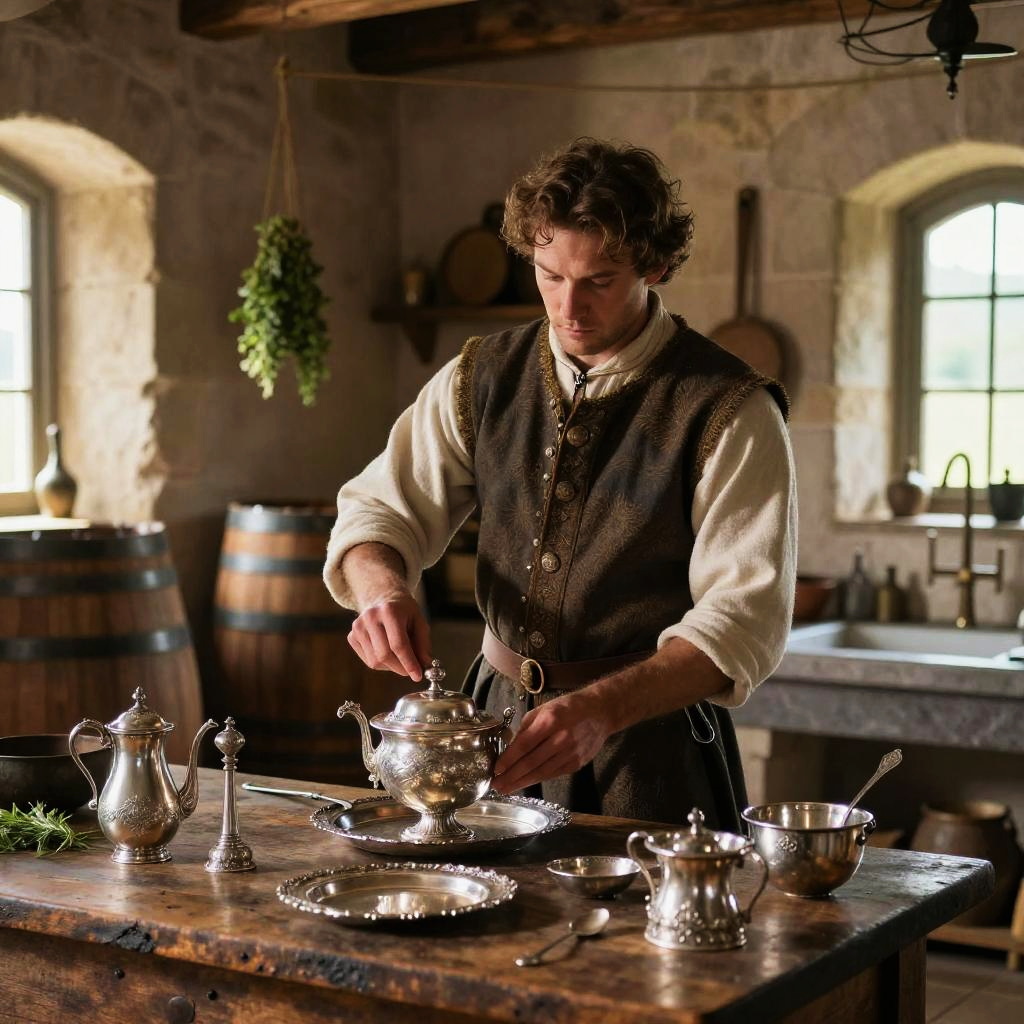 Medieval Butler Polishing Silverware