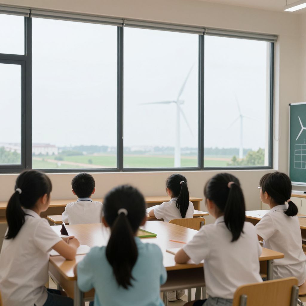 A group of children learning about wind energy in a classroom with large windows facing a wind turbine, showcasing educational efforts in renewable energy solutions.