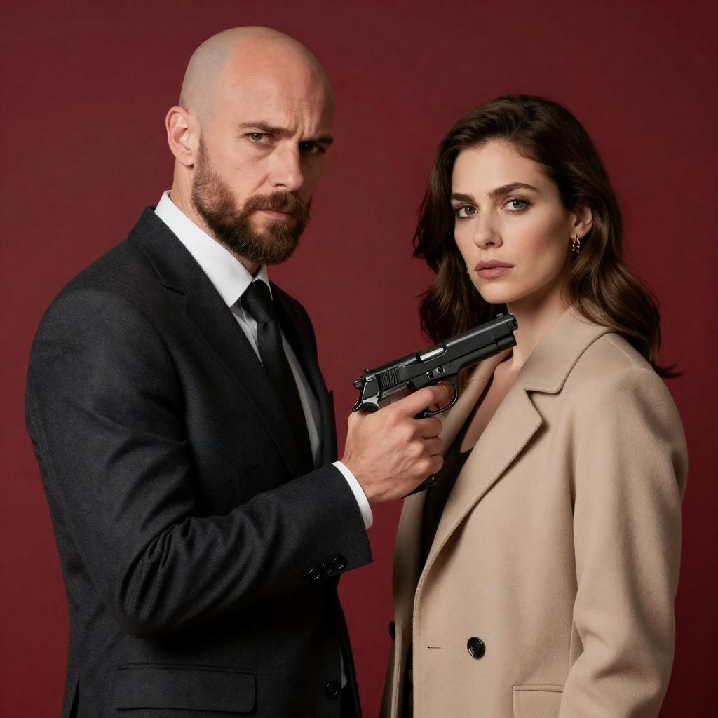 Photograph of three people sitting at a round table in a café. Woman on left wears black dress and wide-brimmed hat, looking to the right. Woman in center wears light gray coat, holding a pink rose, looking at the bald man on the right. Bald man in black leather jacket, looking at the woman in the center. Wood-paneled wall and lace curtain in background. White cups and saucers, sugar jar, and greenery in foreground. Intense expressions on faces.