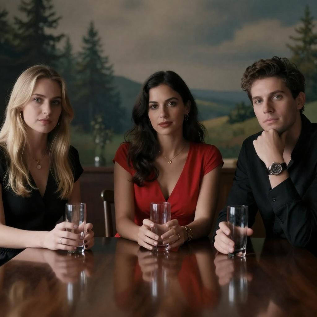 A photograph of three people sitting at a round table in a wood-paneled café with lace curtains. A woman on the left wears a black dress and wide-brimmed black hat, looking thoughtfully to the right. A woman in the center wears a light gray coat, holds a pink rose, and gazes at the bald man on the right. The man wears a black leather jacket and looks back at the woman. The table has two white cups and saucers, a sugar jar, and salt and pepper shakers.