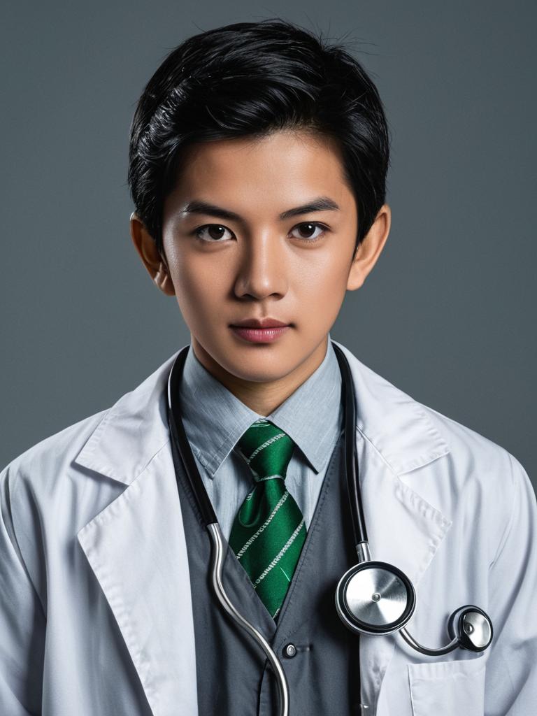 Photograph of an Asian male in his 20s with short, black, neatly-combed hair, wearing a white lab coat over a gray shirt and green striped tie. A silver stethoscope hangs around his neck, with the chest piece resting on his left side. He has a neutral expression and is centered against a plain, gradient gray background. His skin tone is light, and his dark eyes are focused directly at the camera, creating a professional and serious demeanor. The image is sharply focused, highlighting the textures of his clothing and the smoothness of his skin.
