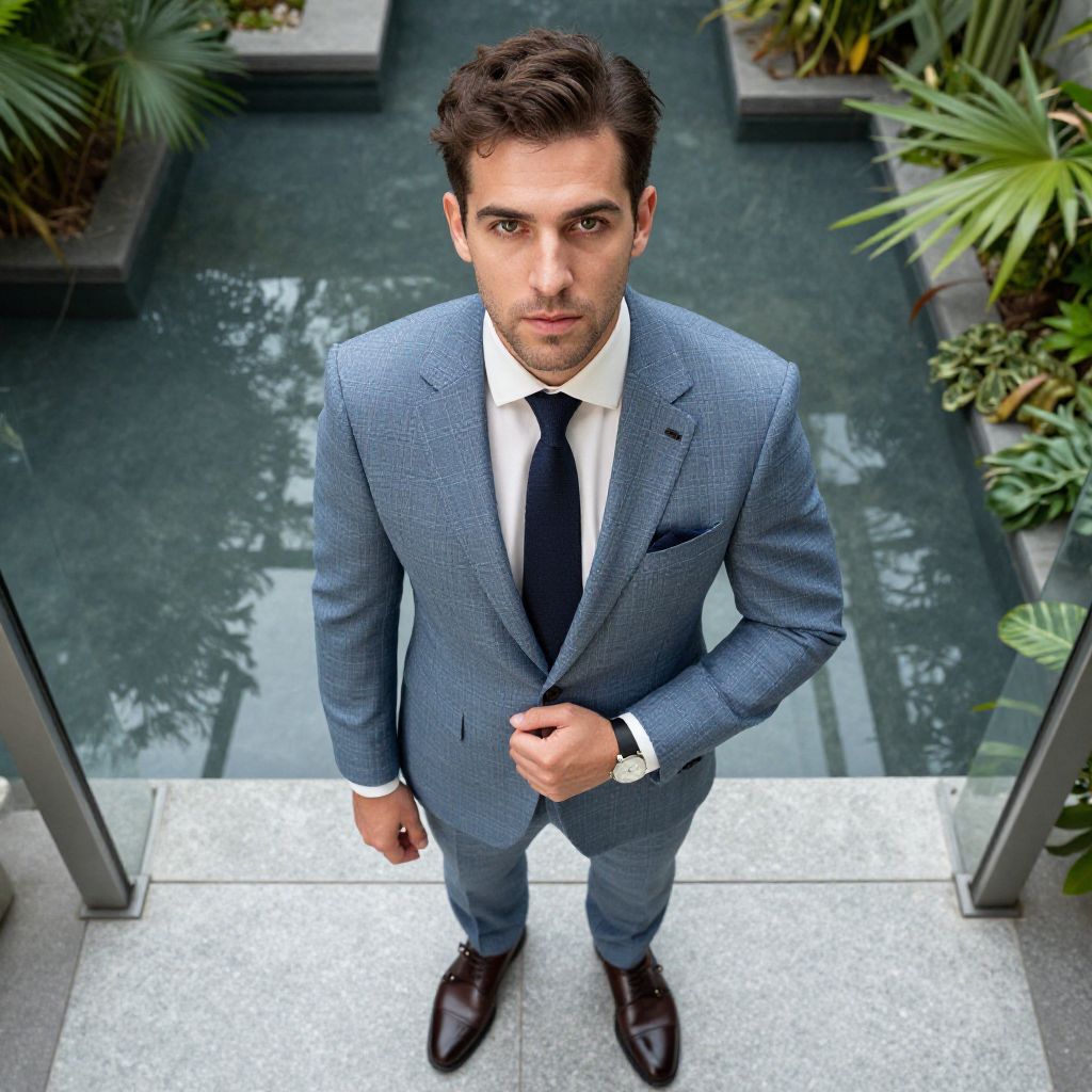 A man, ivory linen suit, tailored fit, crisp white dress shirt, vibrant floral tie, brown leather loafers, open-air platform, gentle ocean breeze, vibrant sunset casting warm hues, overhead shot, confident expression. Man has masculine face and piercing eyes