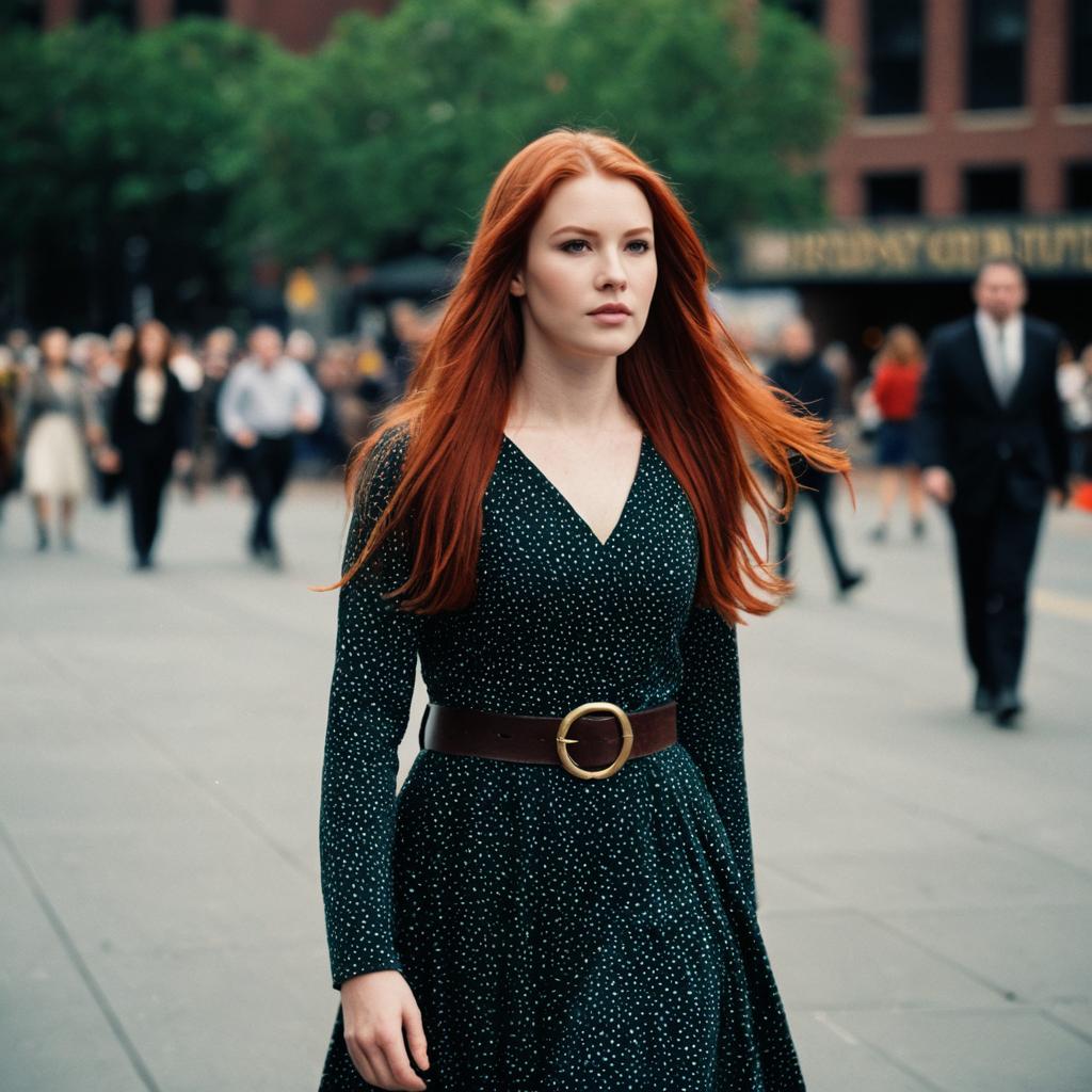 A young woman with bright red hair wearing a vintage-style green dress with long sleeves, a white collar, and a brown belt with a circular buckle. She is standing on a paved pathway in a park-like setting with green grass, trees, and lampposts in the background. The woman is looking directly at the viewer with a neutral expression and closed mouth.