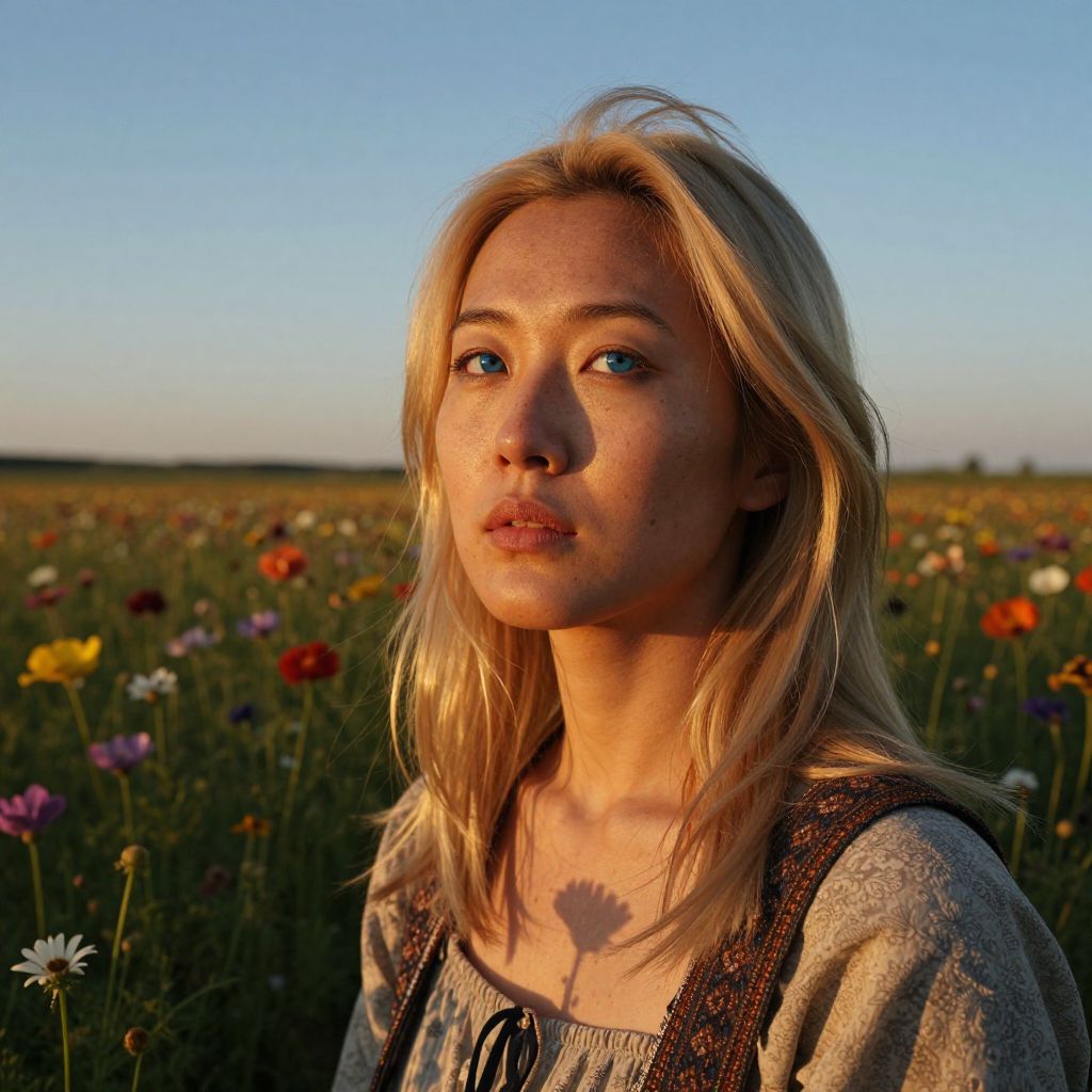 Craft a hyper-realistic portrait of an East Asian woman with piercing blue eyes and silky blonde hair, bathed in the warm glow of the setting sun's long shadows across her rugged features. Captured from an unconventional low angle, this striking scene showcases her serene yet defined expression amidst vibrant wildflowers stretching towards the horizon. The intricate interplay of light and shadow on her weathered skin, vintage-inspired attire, and lush backdrop evoke a range of emotions from contemplation to awe, drawing viewers into a timeless portrayal of resilience and beauty amidst nature's ever-changing landscape.