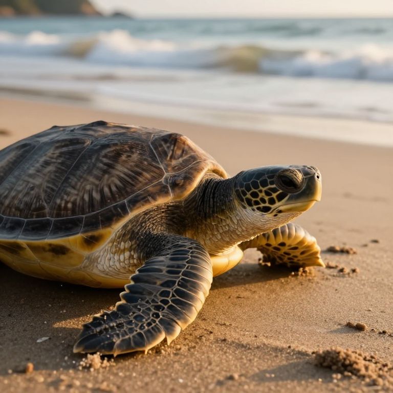 Close-up of a turtle on a sandy beach during golden hour, textured shell and scales highlighted by warm sunlight, gentle waves rolling in the background, serene and tranquil coastal environment, ultra-detailed natural depiction.