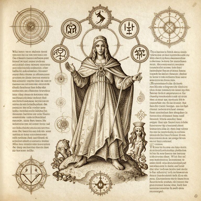 Ink drawing of a robed, haloed woman with outstretched arms, surrounded by mystical symbols and text, standing on a rocky base.