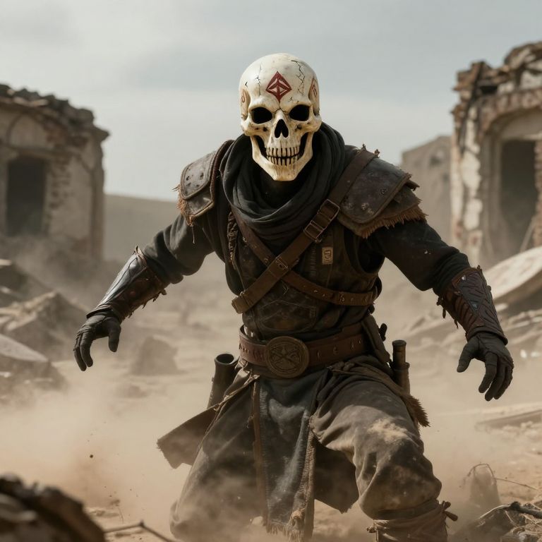 Boneface warrior in post-apocalyptic wasteland, bone mask adorned with tribal markings and cracks, dust swirling around, ruins in background, gritty and realistic style, dynamic pose with muted earth tones and subtle highlights, cinematic composition