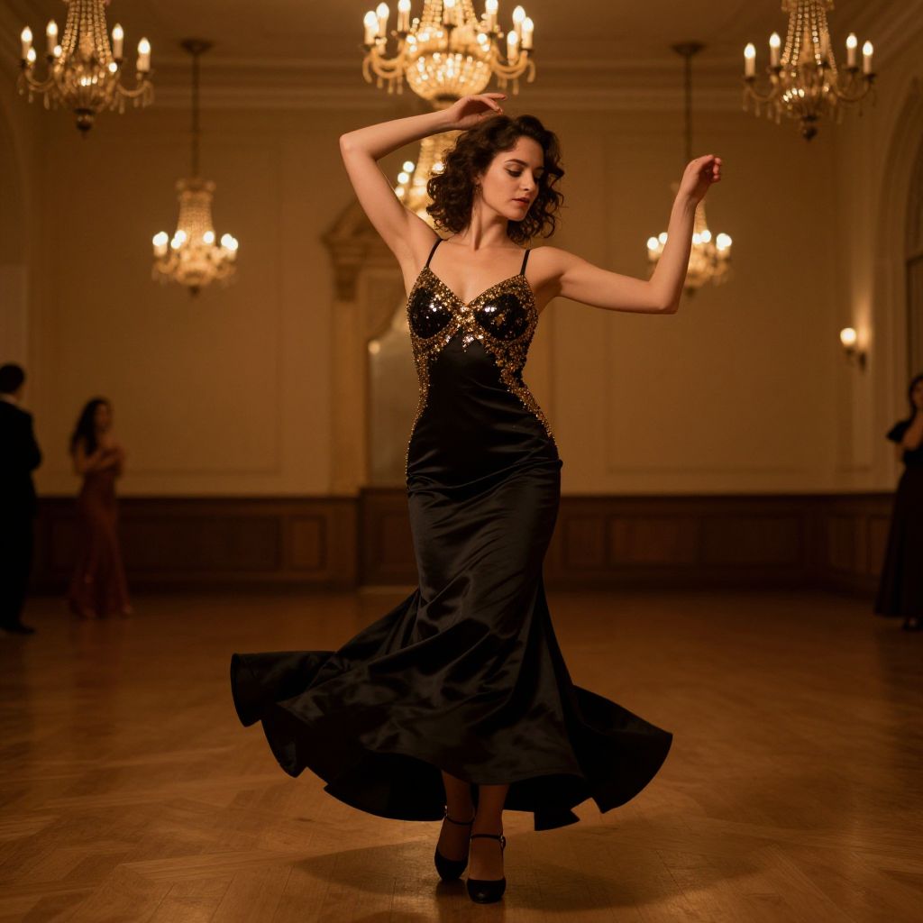A sexy dress prompt: A satin black dress with gold sequins catches the light as a woman dances in a vintage ballroom, chandeliers above sparkle in the soft glow, her movements fluid and confident, embodying timeless glamour and intimate style.