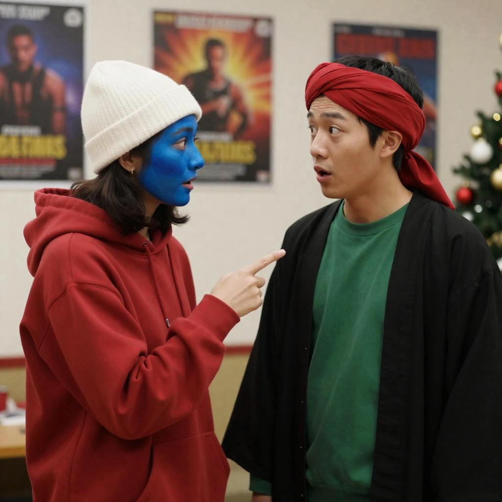 Two people in a room, one with blue face paint and a white knit hat, wearing a red hoodie, pointing; the other with a red turban, green shirt, and black robe, looking surprised. Background: posters, Christmas decorations.