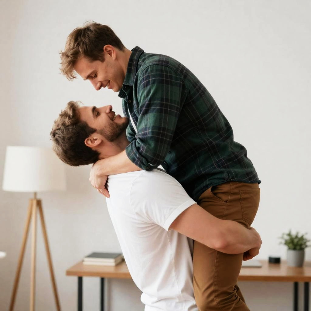 Two men in a brightly lit room. One man in a white shirt lifts the other, who wears a green plaid shirt and brown pants. The lifted man bends forward, eyes closed, smiling. Background includes a tall lamp and a desk. Both men have short, light brown hair. The lifted man is being playfully carried.