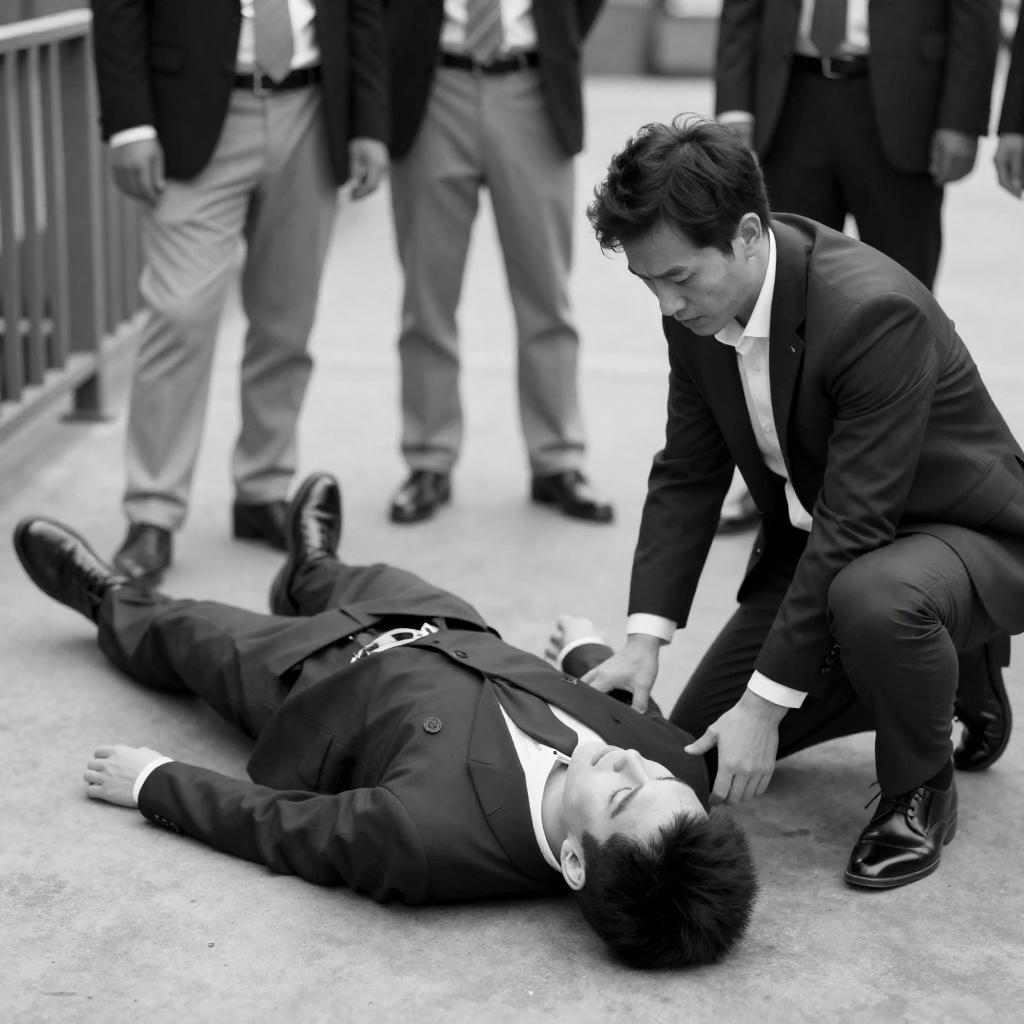 Two men in an outdoor parking lot. The standing man with long brown hair, wearing a white shirt and blue jeans, holds the arm of the fallen man with medium brown hair, wearing a gray shirt and pants. The fallen man lies face-down on the ground, eyes closed. Dense green foliage in the background. The standing man's expression is concerned, while the fallen man's expression is neutral.