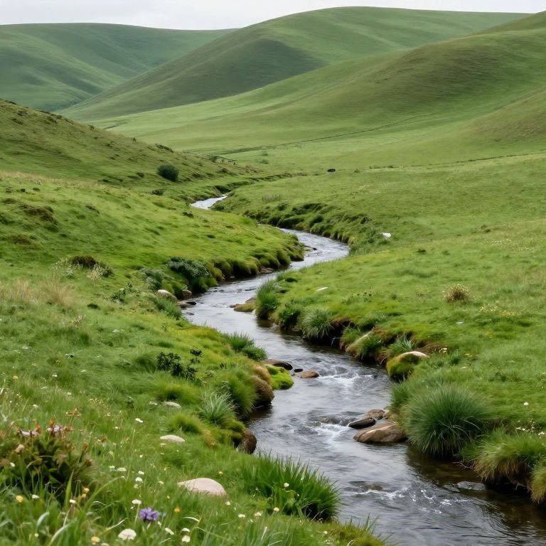 This photograph captures a serene, lush green landscape with rolling hills in the background. A narrow, winding stream flows through the center, bordered by vibrant green grass and small rocks. Wildflowers with white and purple petals dot the foreground, adding color contrast. The hills are covered in verdant grass, with subtle shadows indicating gentle slopes. The sky above is overcast, casting a soft light over the scene. The image exudes tranquility and natural beauty, with the stream's gentle ripples adding a sense of movement to the otherwise still landscape.