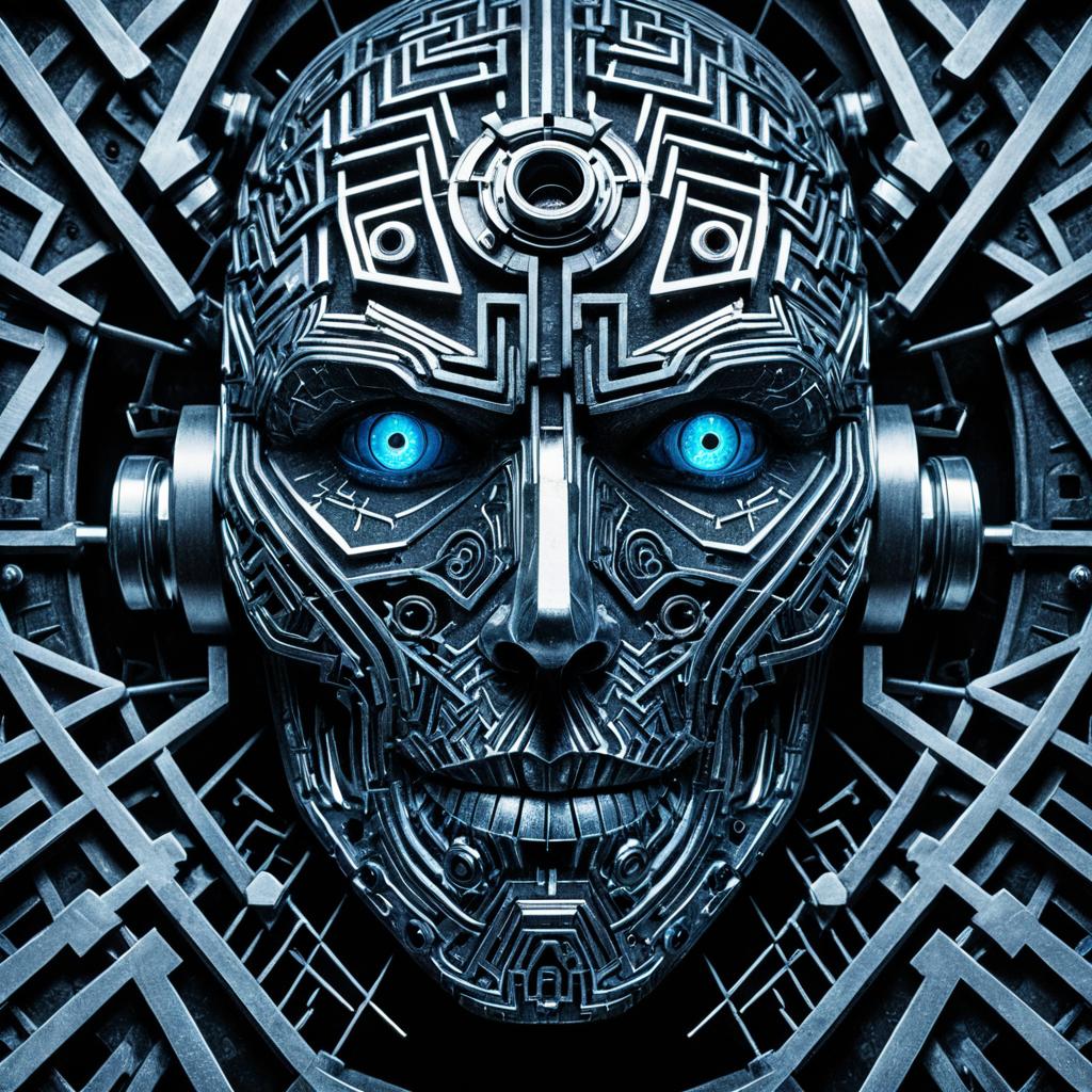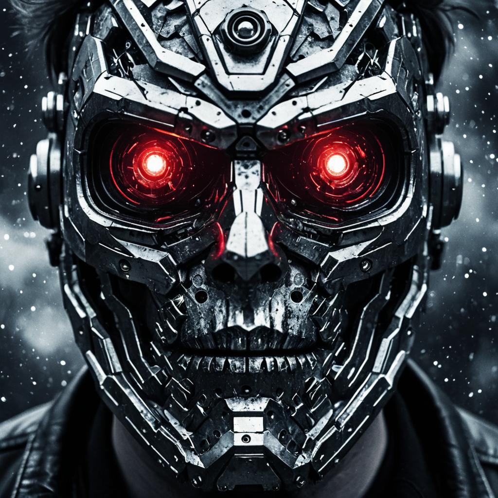 Close-up of a futuristic robotic skull face with intricate fractured metallic surfaces and glowing red eyes resembling nebulae. The design features gunmetal and pearl white tones, set against a cold, snowy atmosphere that enhances the enigmatic and raw style of the mechanoid face.