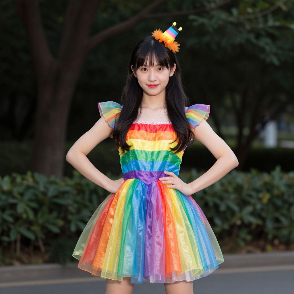 Rainbow Fancy Dress Costume, girl in a rainbow dress posing for a picture