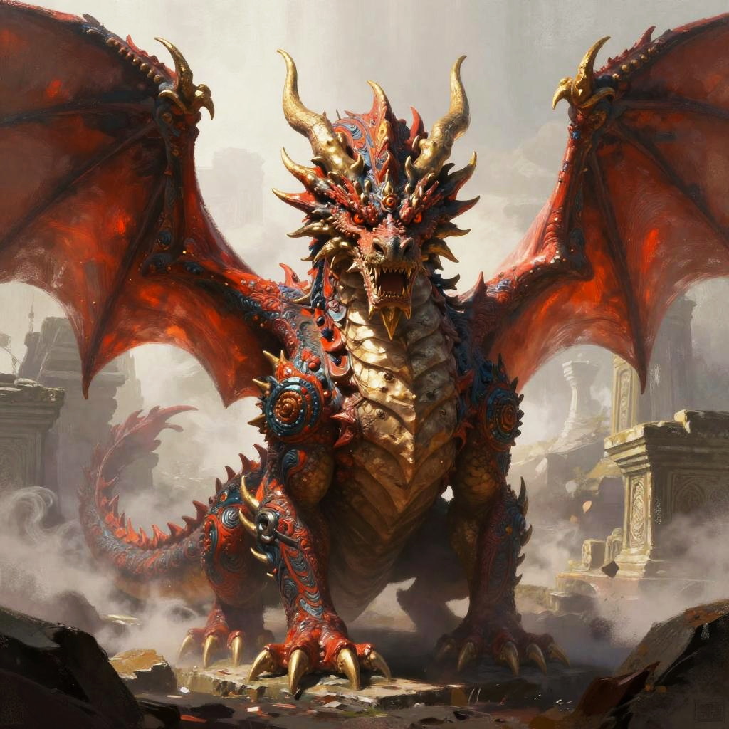 Dragon looking at camera, majestic and fierce, surrounded by mist and ancient ruins, vibrant colors with dramatic shadows, intricate textures on wings and face, digital painting