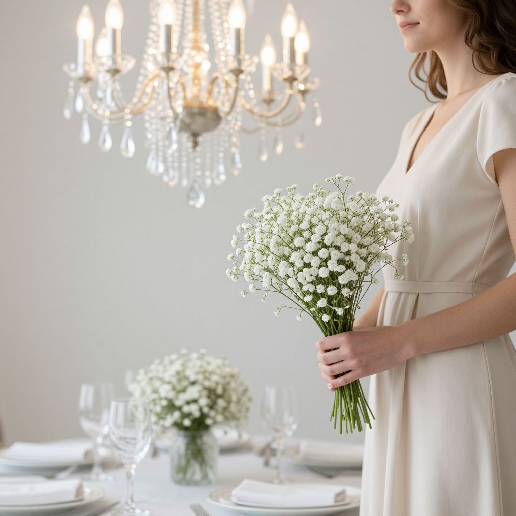 Elegant table setting featuring a glass chandelier above, paired with a woman in a cream dress holding a delicate bouquet of baby's breath, showcasing the refined decor by Utopian Events.