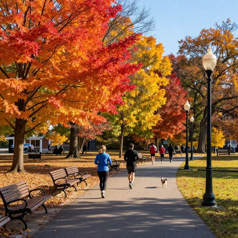 Trumbull urban park in autumn, vibrant fall foliage with vivid reds, oranges, and yellows, people jogging and walking dogs on winding paths, wooden benches and vintage lampposts, clear blue sky overhead, lively yet peaceful community space captured in warm tones