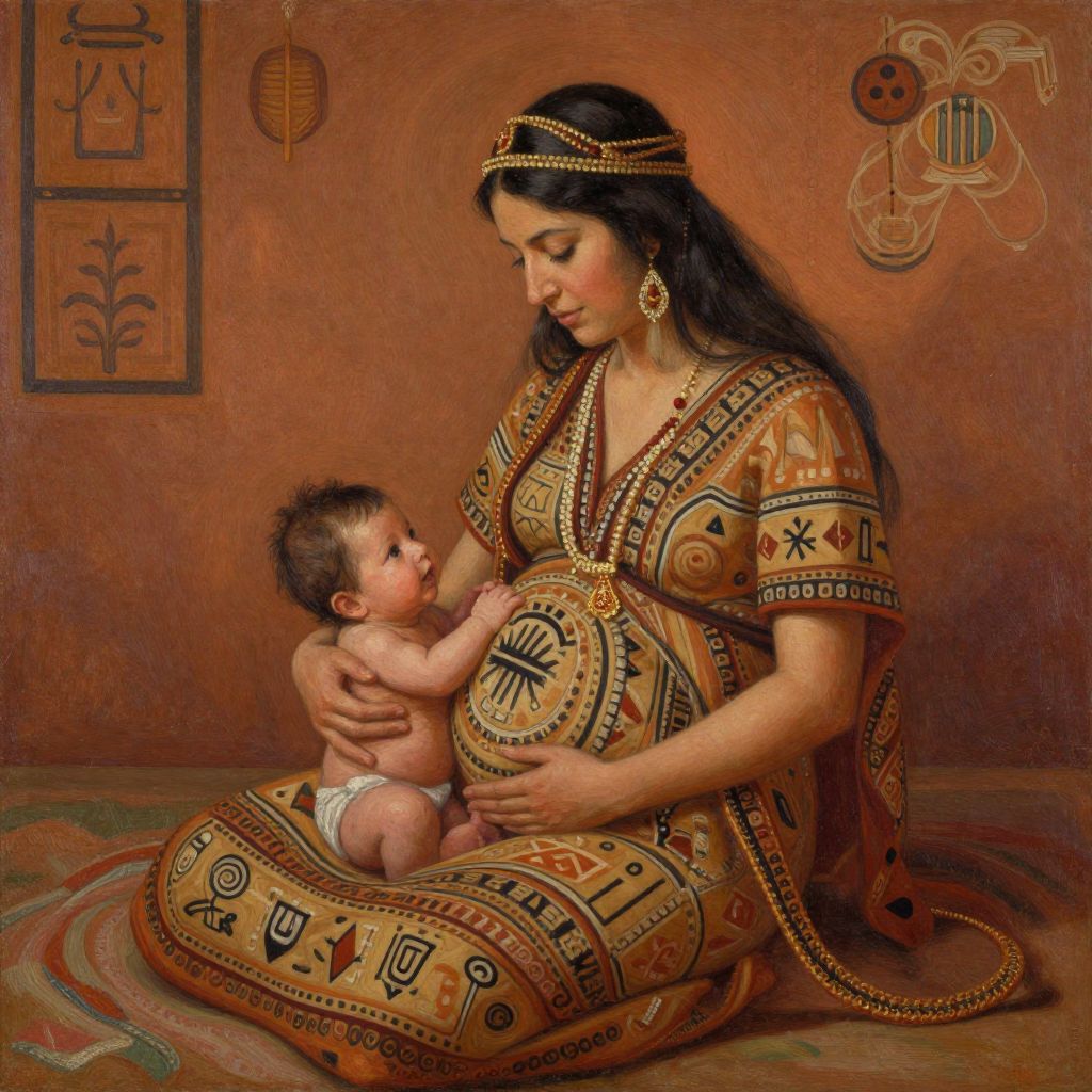 Childbearing in an ancient cultural context, traditional garments and ceremonial elements surrounding the mother, warm earthy tones, stylized patterns and symbolic motifs, rich textures conveying heritage and reverence for the miracle of birth, painterly style.