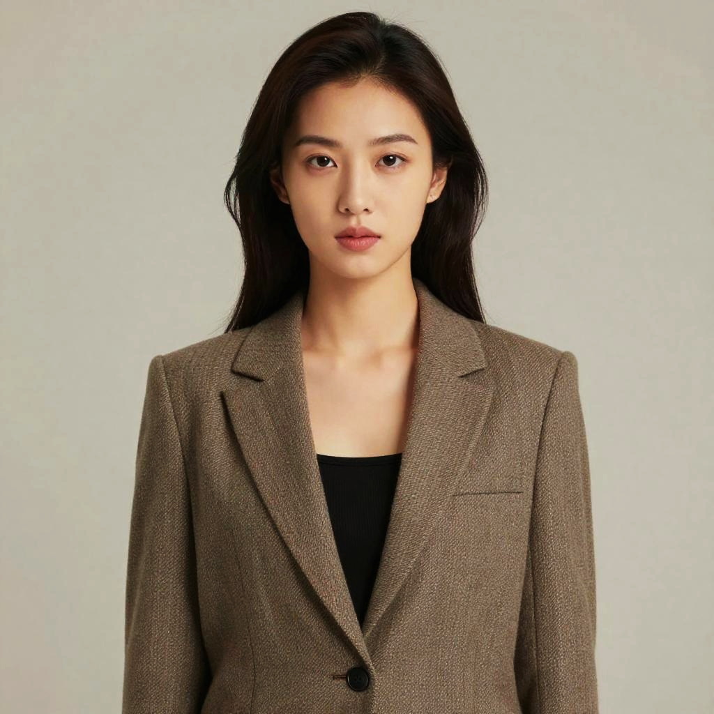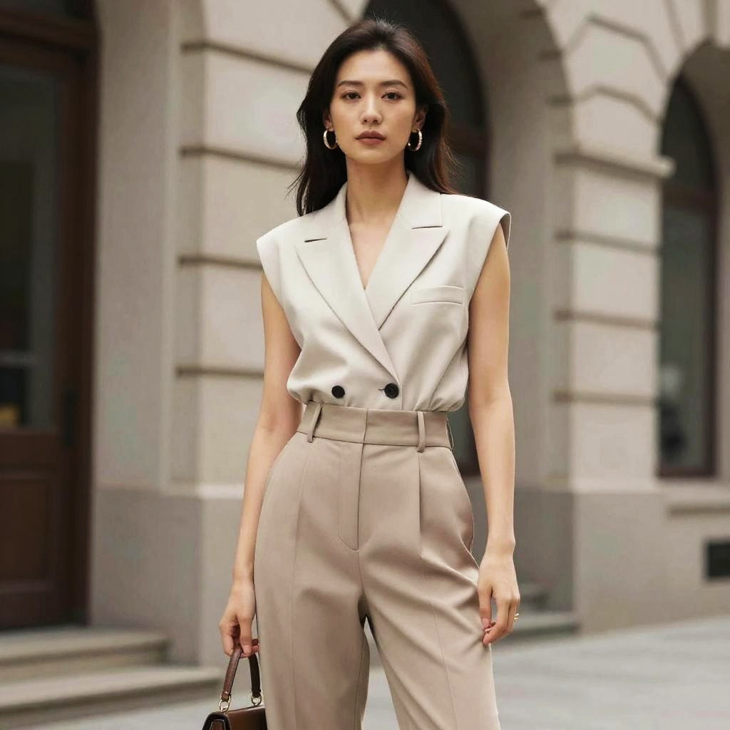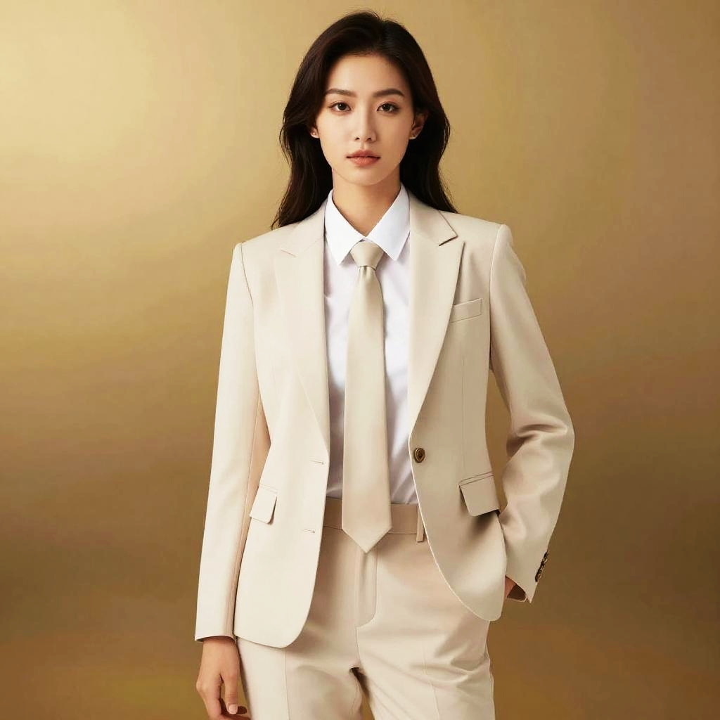 Portrait of an elegant Asian woman wearing a light beige silk blouse paired with matching tailored high-waist trousers. The model stands gracefully against a neutral background with subtle lighting highlighting the smooth texture of the blouse and the clean lines of the outfit. Her dark hair is styled loosely, and she accessorizes with small hoop earrings. Ideal for fashion, lifestyle, or professional branding.