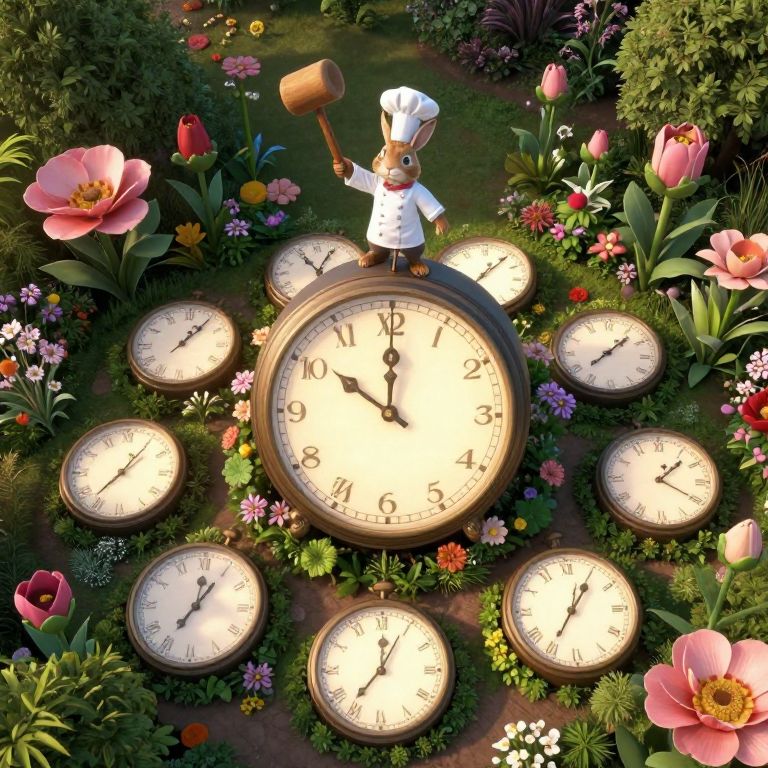 An aerial view of an enchanting garden landscape showcases a whimsical blend of time and nature. Overgrown with oversized flora resembling various stages of clock development, from fully bloomed to budding, this surreal scene features a central pendulum acting as the focal point. A playful rabbit chef perched atop a colossal clock face prepares to strike, wielding a sizable wooden mallet in anticipation. The soft luminescence emanating from the clock faces casts an ethereal glow over the garden, evoking feelings of both tranquility and eagerness within this peculiar setting.