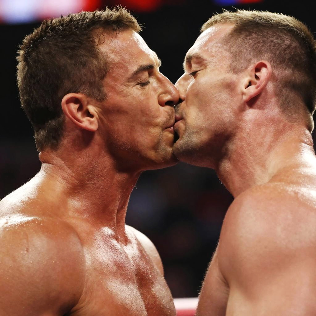 Photograph of two muscular, shirtless men with short brown hair, kissing passionately in a dimly lit arena. Both men have fair skin, defined jawlines, and visible sweat on their faces and necks, indicating physical exertion. The background is blurred with dark and red lights, suggesting a sports event or fight setting. Their eyes are closed, and their lips are pressed together, emphasizing the intensity of the kiss. The image focuses on their upper bodies and faces, capturing the intimate moment.
