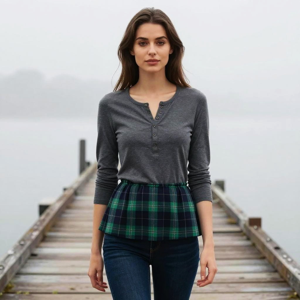 A slim woman in a casual chic outfit featuring a charcoal grey henley shirt with button-up detail, layered with a green and navy plaid peplum hem, and skinny dark denim jeans, stands on a pier with a foggy morning backdrop, evoking a soft, atmospheric visual style. Sexy. Pretty face and beutiful eyes