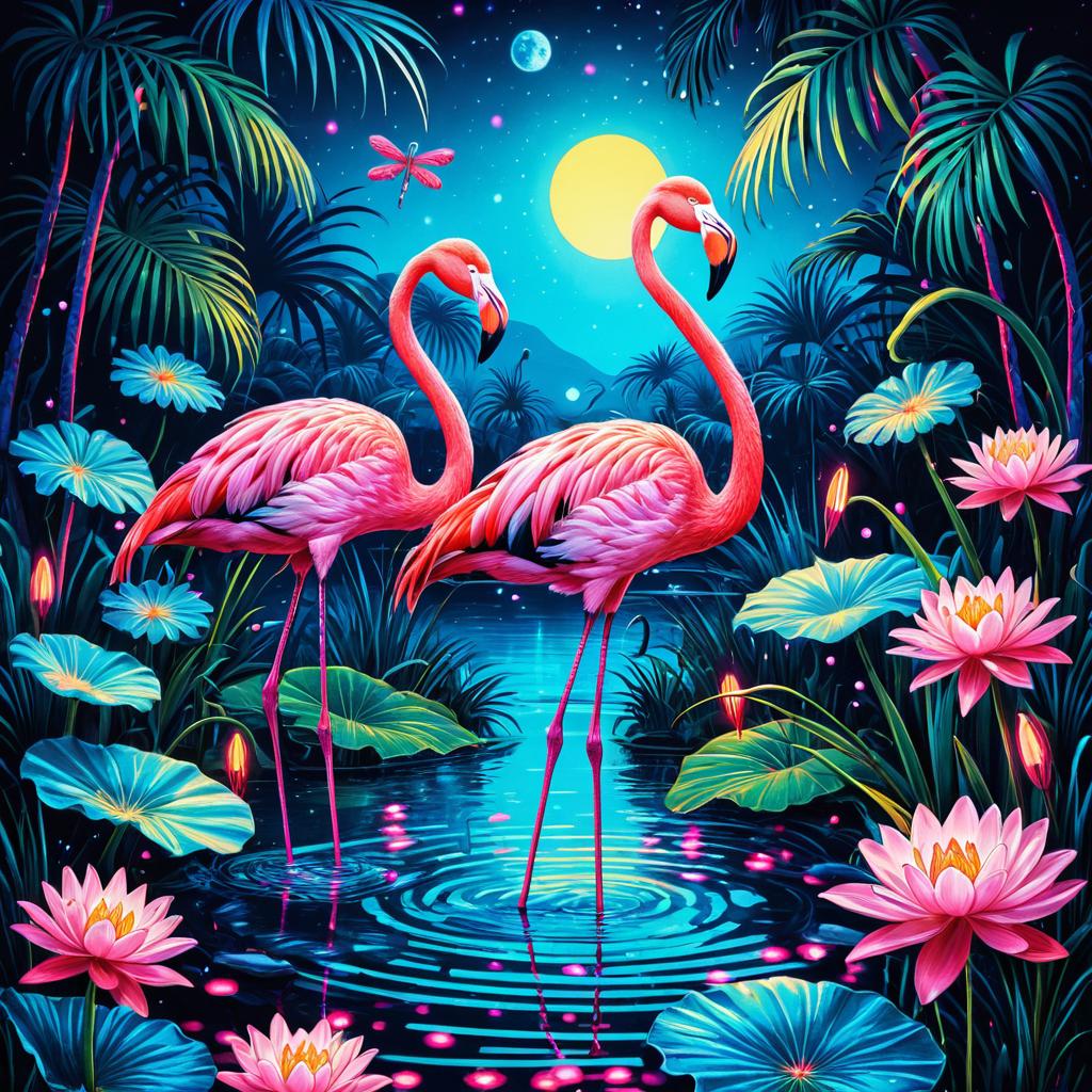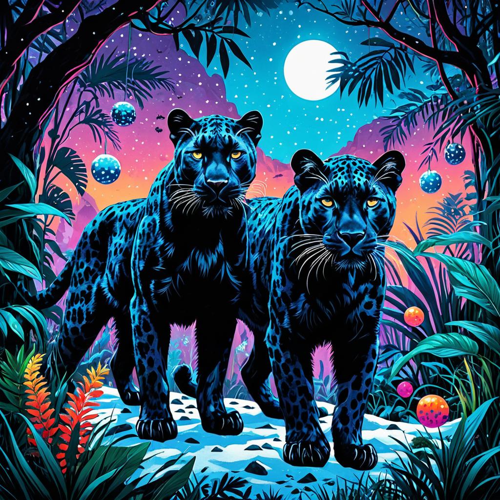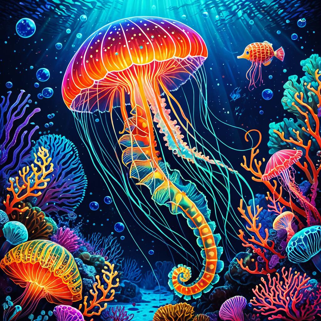 Psychedelic poster illustration of a neon jellyfish and a colorful seahorse, a glowing jellyfish, in a tribal coral reef with bioluminescent algae and radiant bubbles. High quality, vibrant colors, detailed fur, surreal, whimsical, colorful lighting.